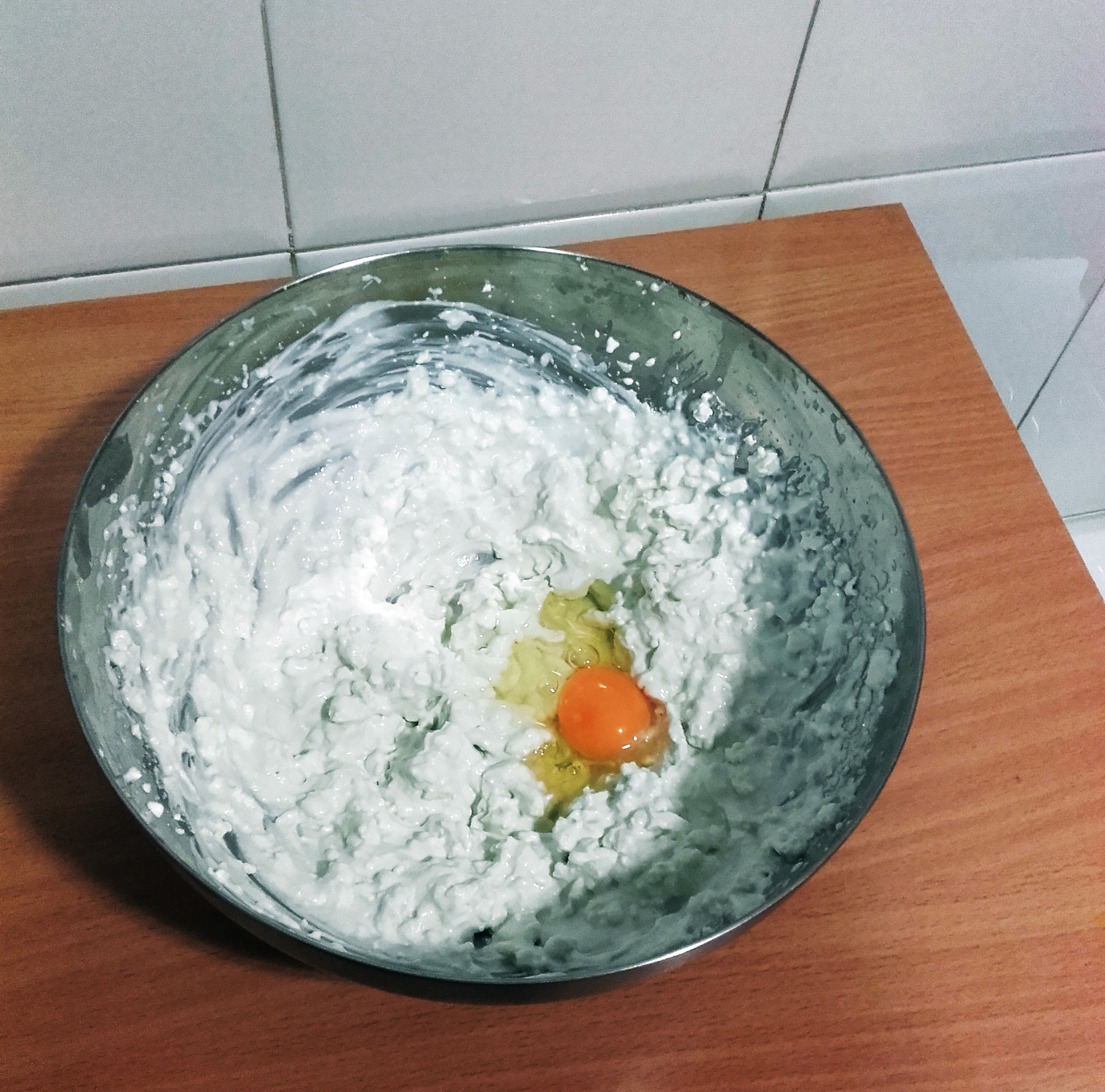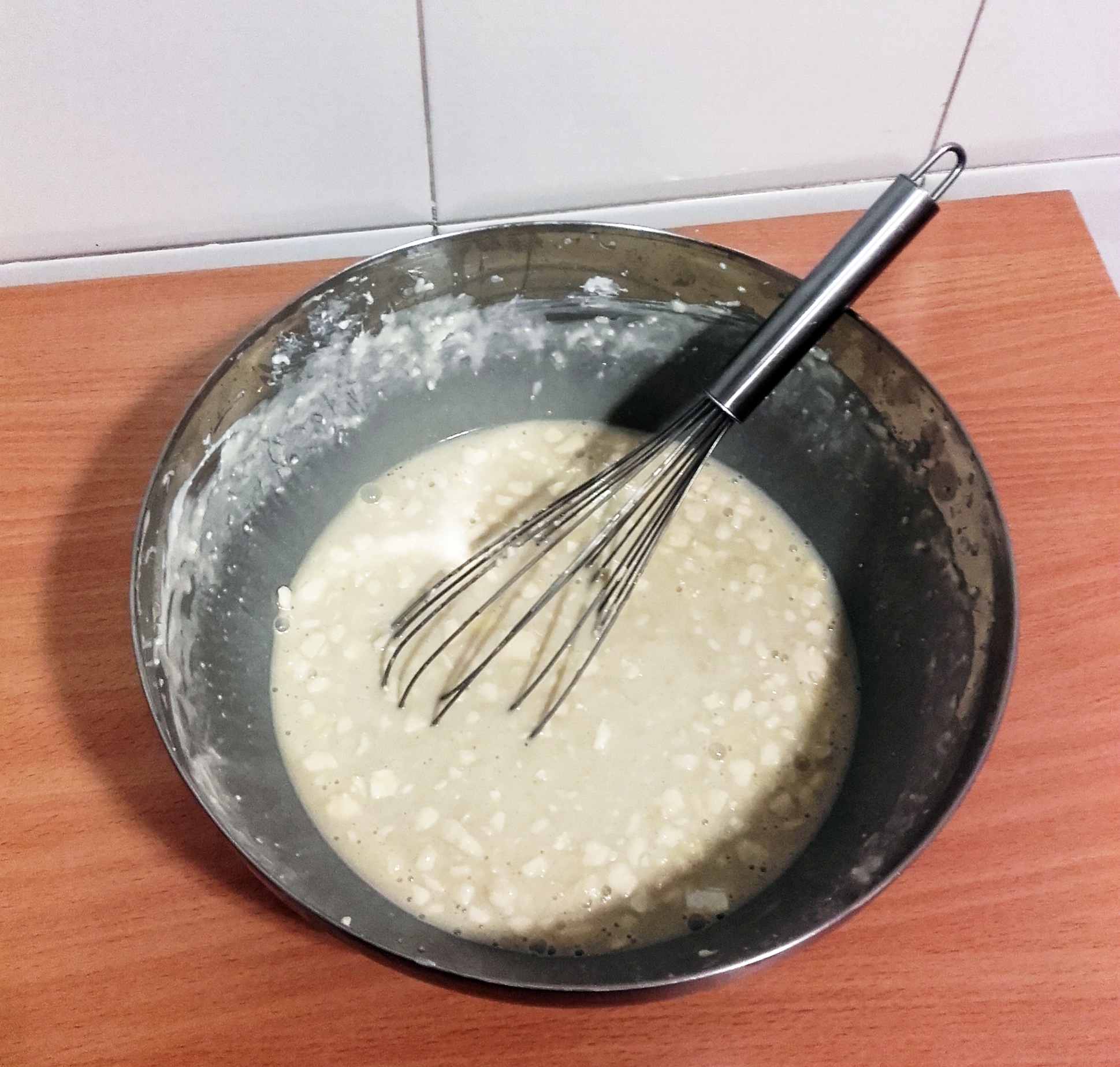5. Y vamos con el relleno: desmenuzamos el queso de cabra y lo mezclamos con el yogur, los huevos y la miel. Batimos con las varillas hasta que quede homogéneo. Probablemente algunos trocitos de queso no se desharán del todo, pero no os preocupéis: le dará un aspecto más rústico… o vikingo, si lo preferís.