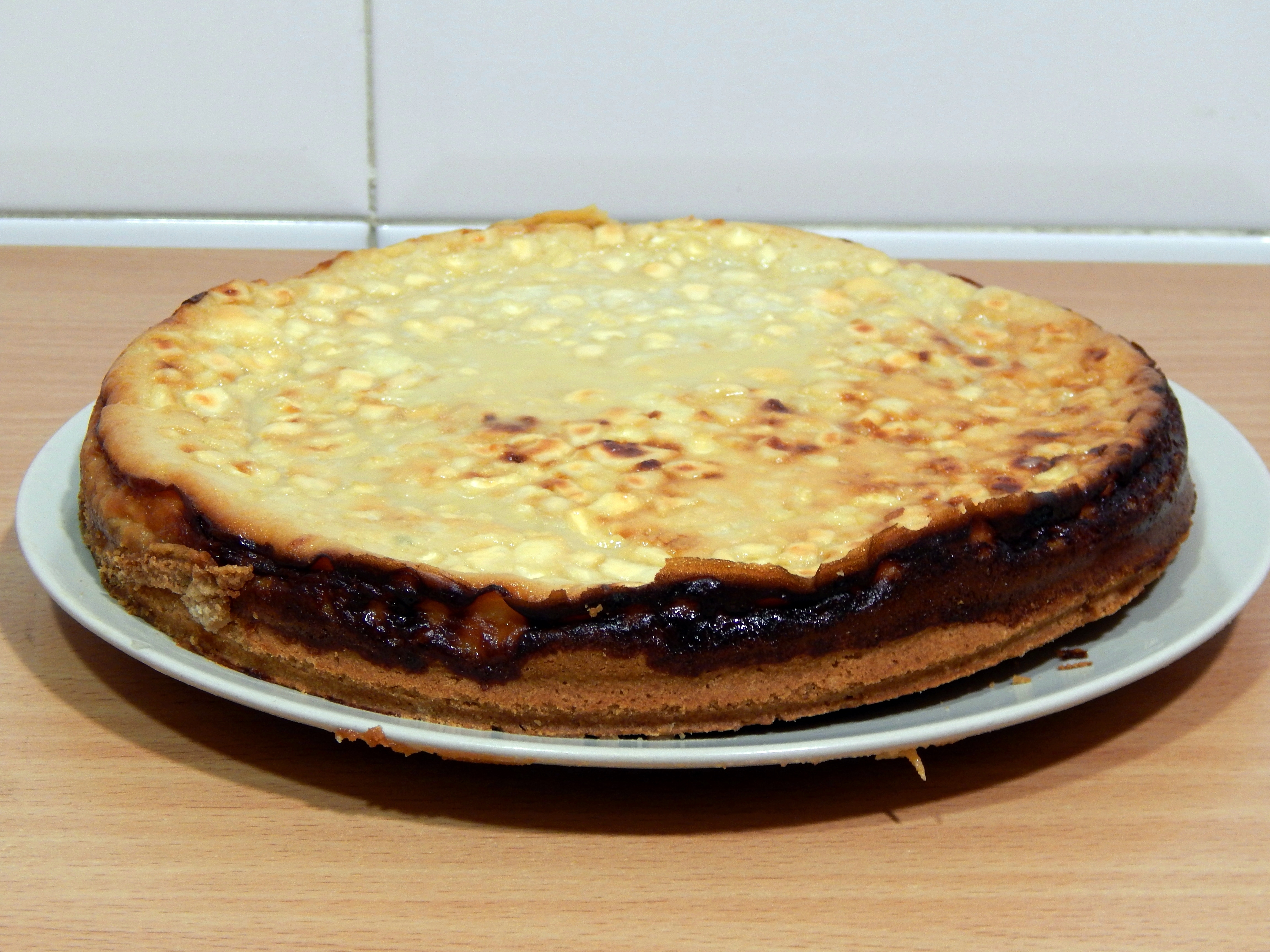 6. Vertemos la mezcla sobre la base que ya teníamos en el horno y lo dejamos, de nuevo a 180-200ºC, durante un mínimo de 45 minutos. Dependiendo del horno puede llegar a tardar una hora o incluso un poco más. Para saber cuándo sacarlo, lo mejor es fijarse en que esté bien cuajado por los bordes. El centro estará un poco más blando incluso cuando esté completamente hecha.