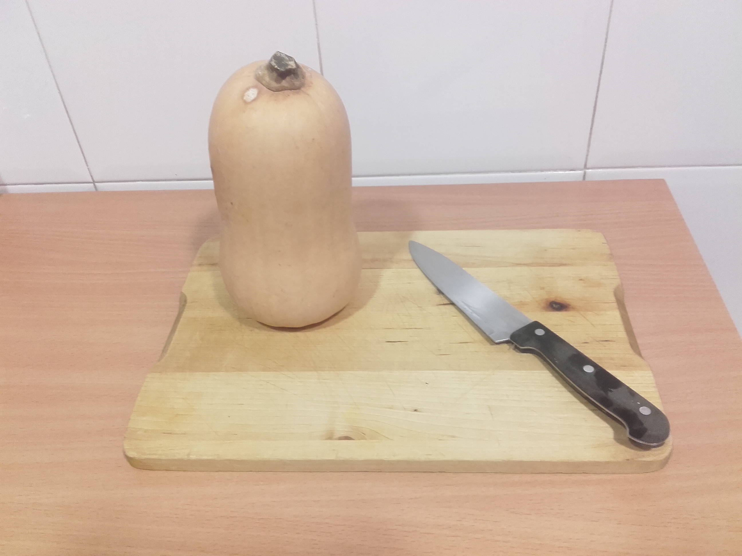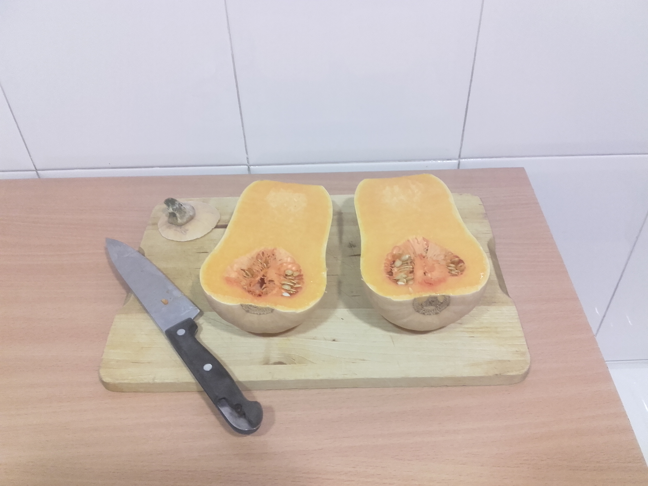 1. Lo primero que haremos será coger una calabaza de aproximadamente un kilo, cortar la parte superior para quitarle el rabo y partirla a la mitad.