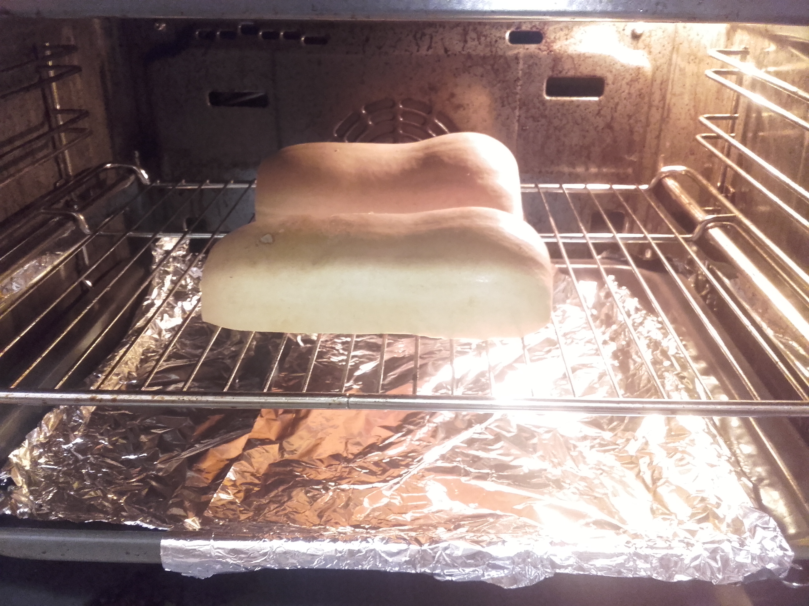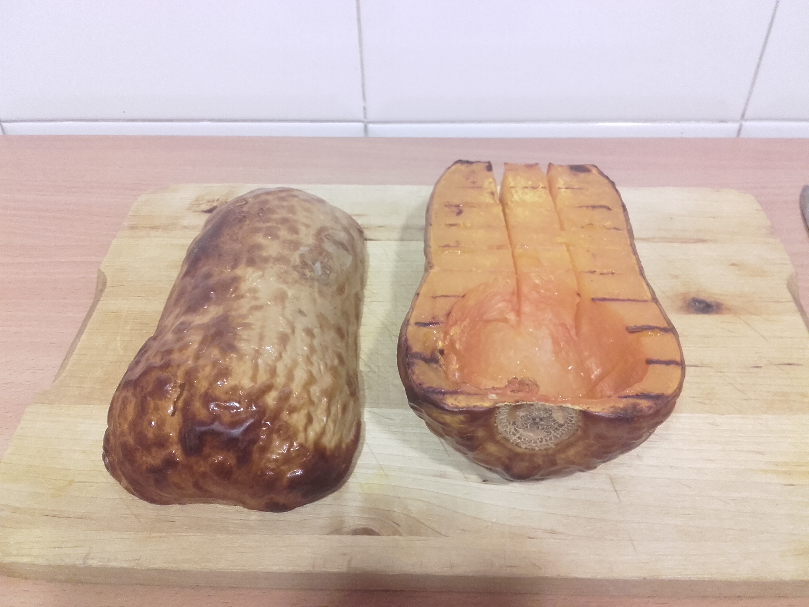 4. ¡Toca hornear! Colocamos las dos mitades de la calabaza bocabajo sobre la rejilla del horno a 200 ºC. El tiempo depende mucho del tamaño y la forma de la calabaza, así que tendréis que estar atentos, pero yo diría que entre media hora y una hora es suficiente. Cuando la piel se vuelva marrón y arrugada, clavad un palillo. Si entra sin resistencia, la calabaza está lista.