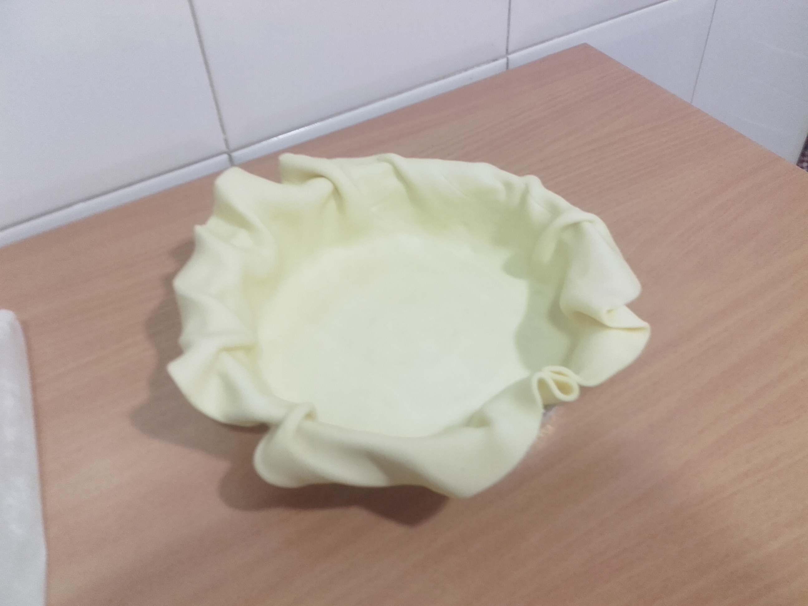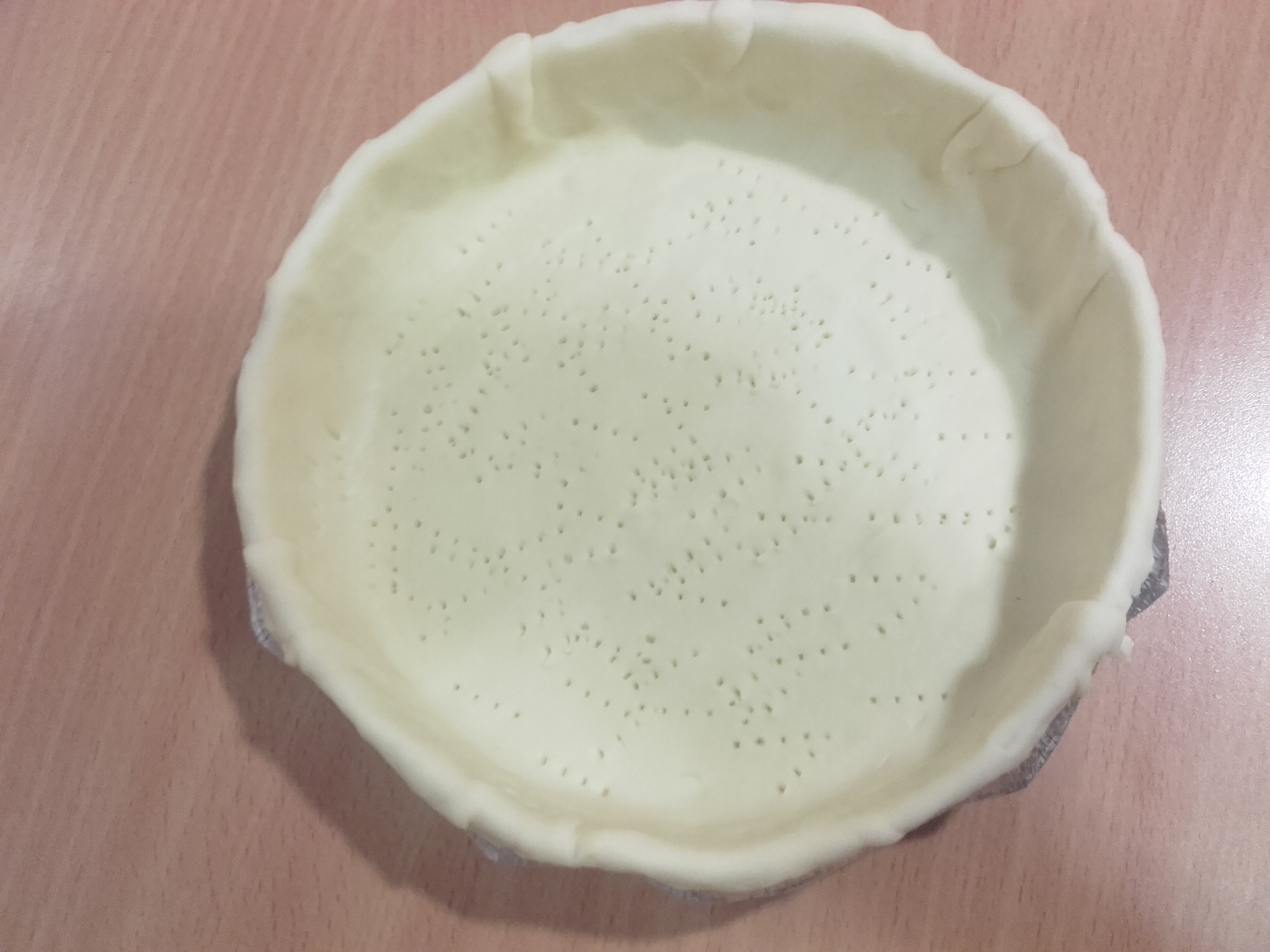5. Mientras esperamos a que hierva el puré, extendemos la masa quebrada y la ponemos en un molde. Pinchamos la base con un tenedor para que no suba.