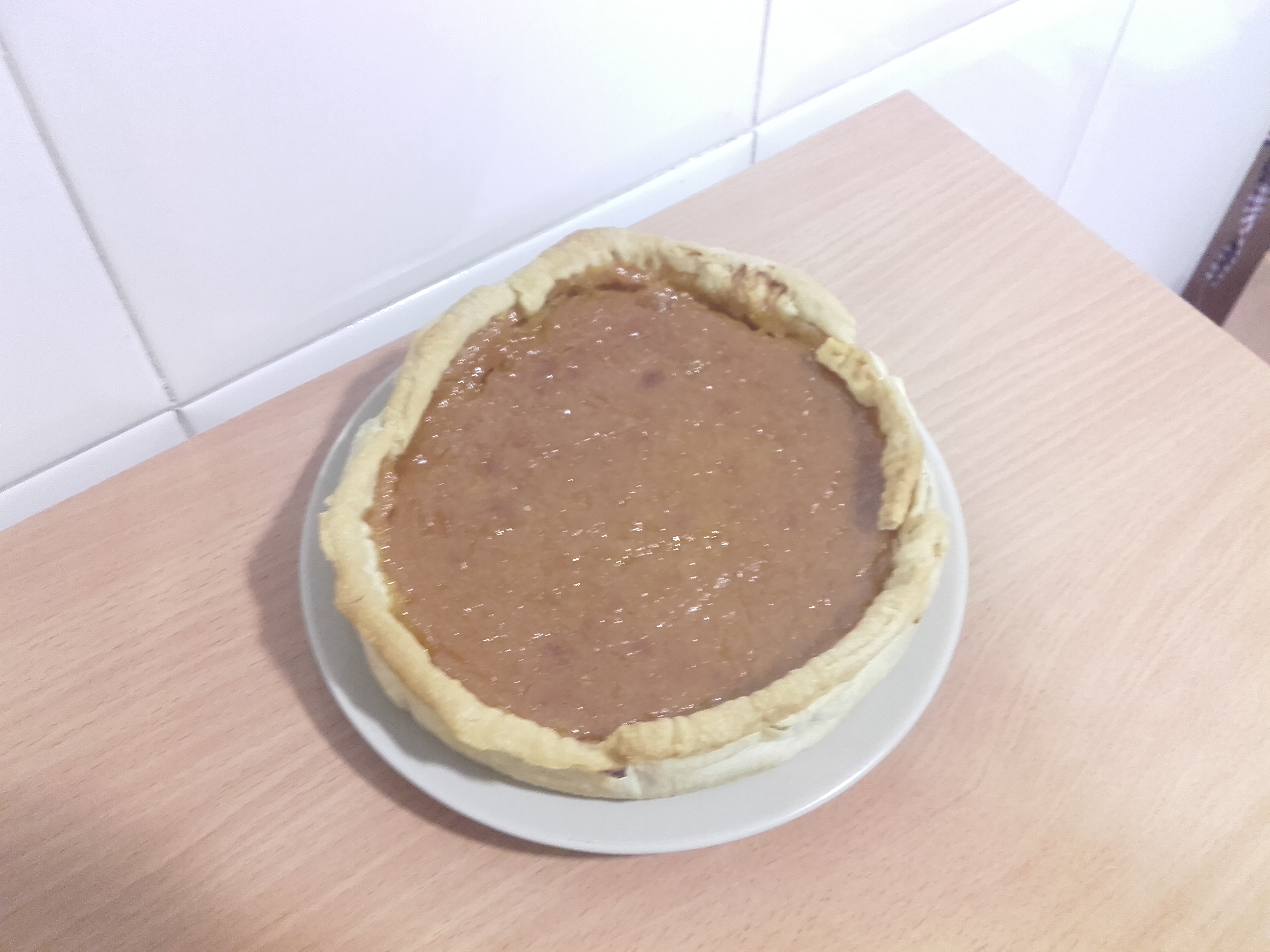 8. Echamos la mezcla en la base de masa quebrada. No sube, así que podéis llenarlo hasta arriba.