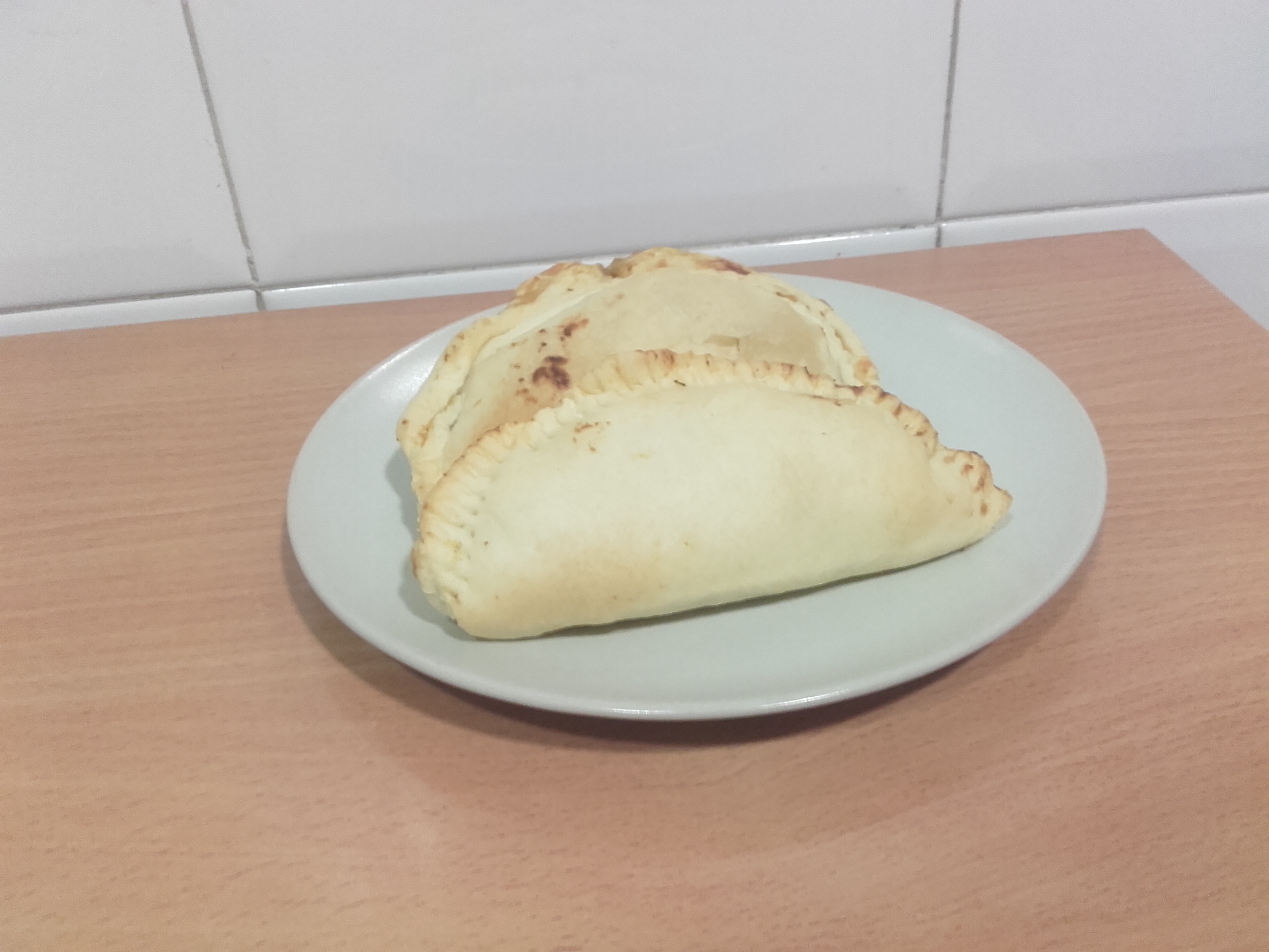 3. Cubrimos el relleno con la mitad libre de la masa, enroscamos los bordes para que no se salga nada y lo sellamos calcando con un tenedor.